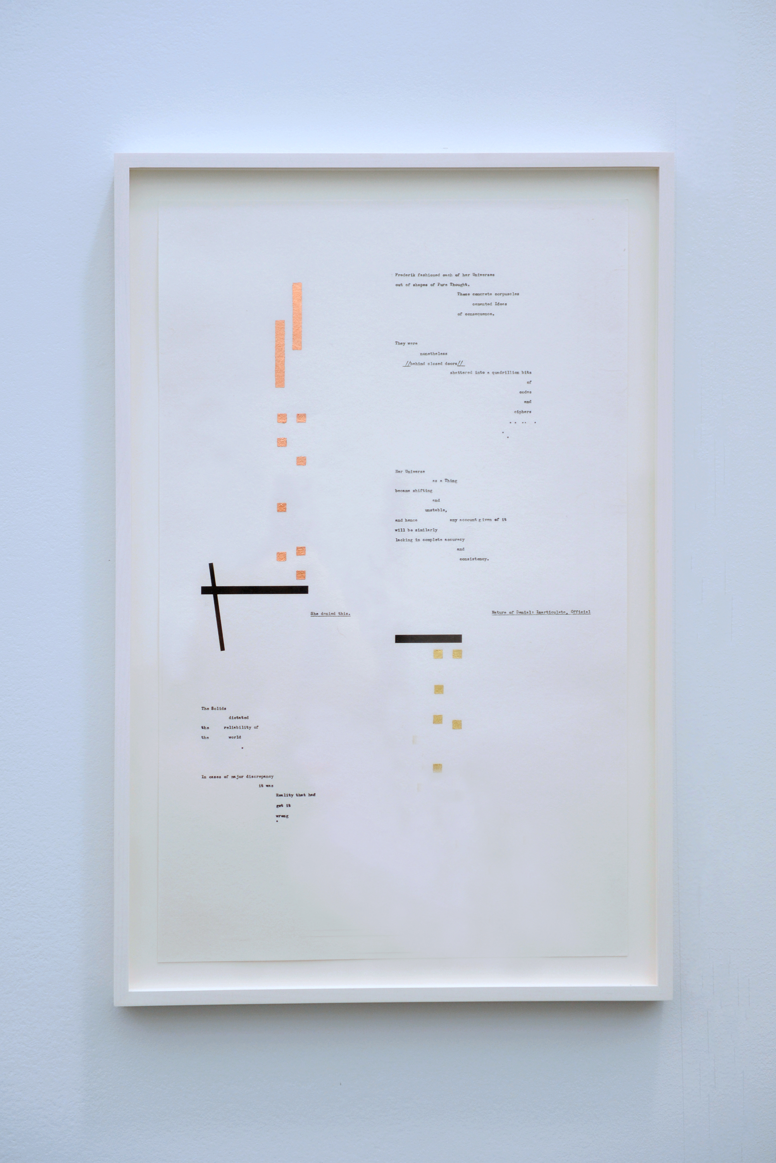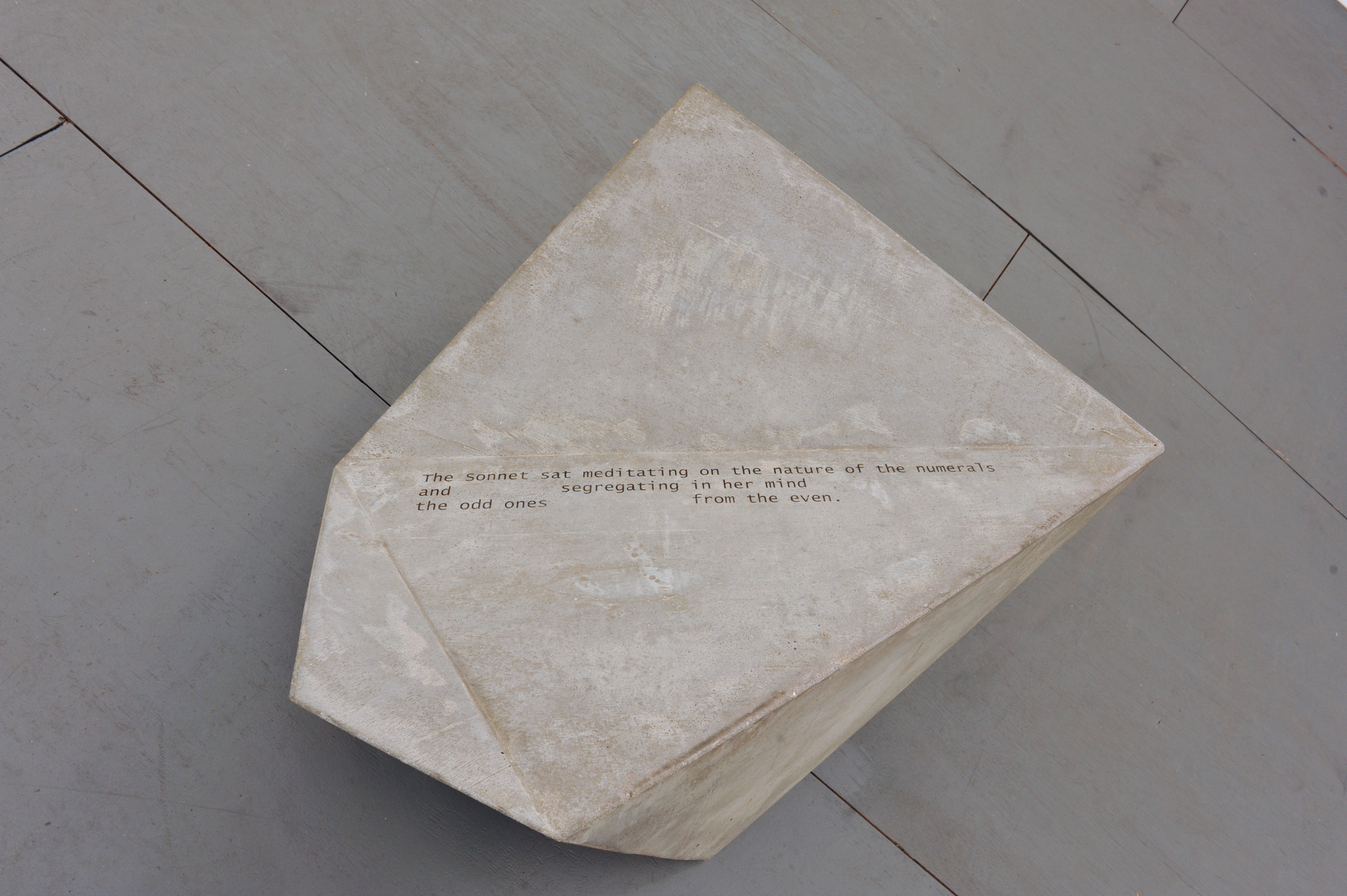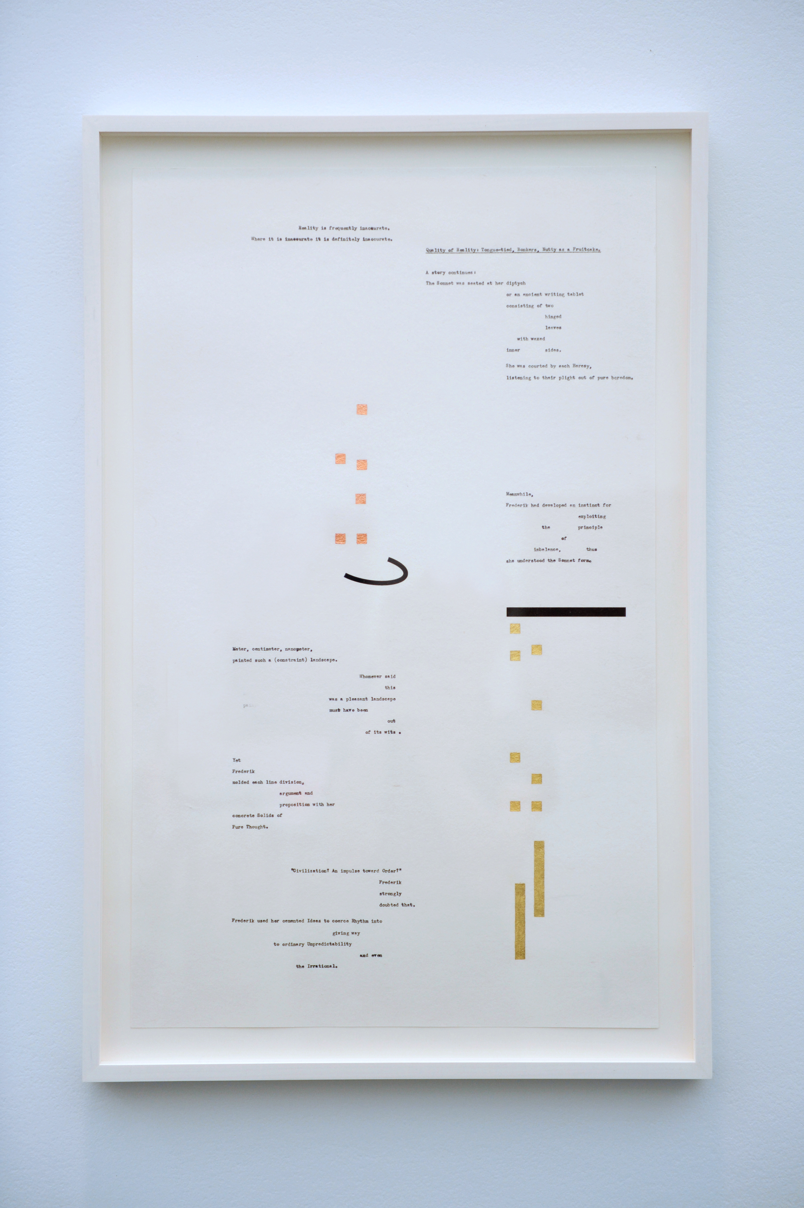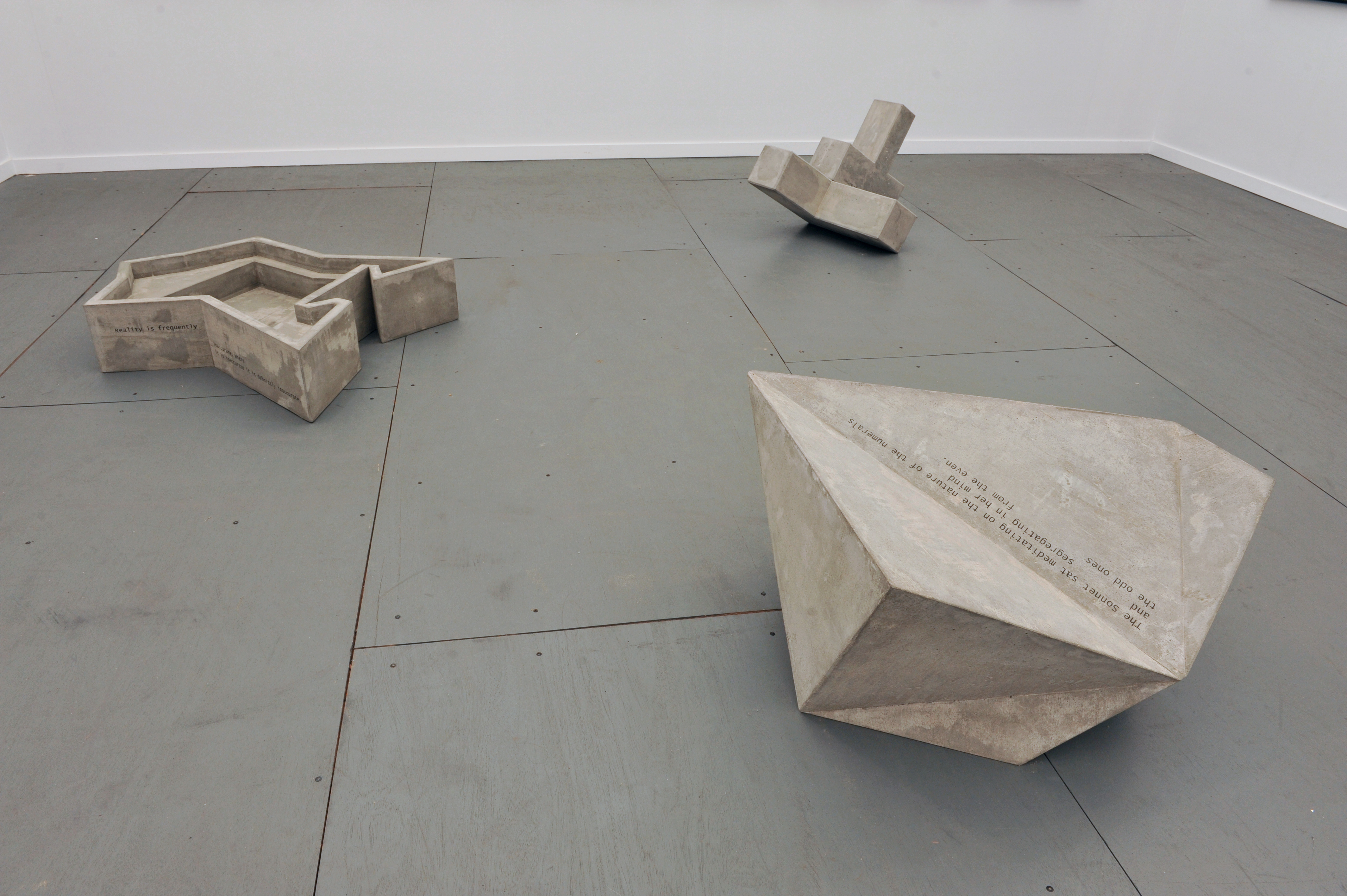“The Solids (toward the Sonnet)”, 2014, Frieze New York“The Solids (toward the Sonnet) #3”, 2014 22 cm x 97 cm x 111 cm Concrete, acrylic paint“The Solids (toward the Sonnet) #3”, 2014 22 cm x 97 cm x 111 cm Concrete, acrylic paint“The Solids (toward the Sonnet) #1”, 2014 46 cm x 95 cm x 79 cm Concrete, acrylic paint“The Solids (toward the Sonnet) #2”, 2014 55 cm x 88 cm x 57 cm Concrete, acrylic paint“Reality is frequently inaccurate” (Frederik), 2014 67 cm x 41 cm Carbon ink, gold and copper on paper“She fashioned each of her Universes” (Frederik), 2014 67 cm x 41 cm Carbon ink, gold and copper on paper