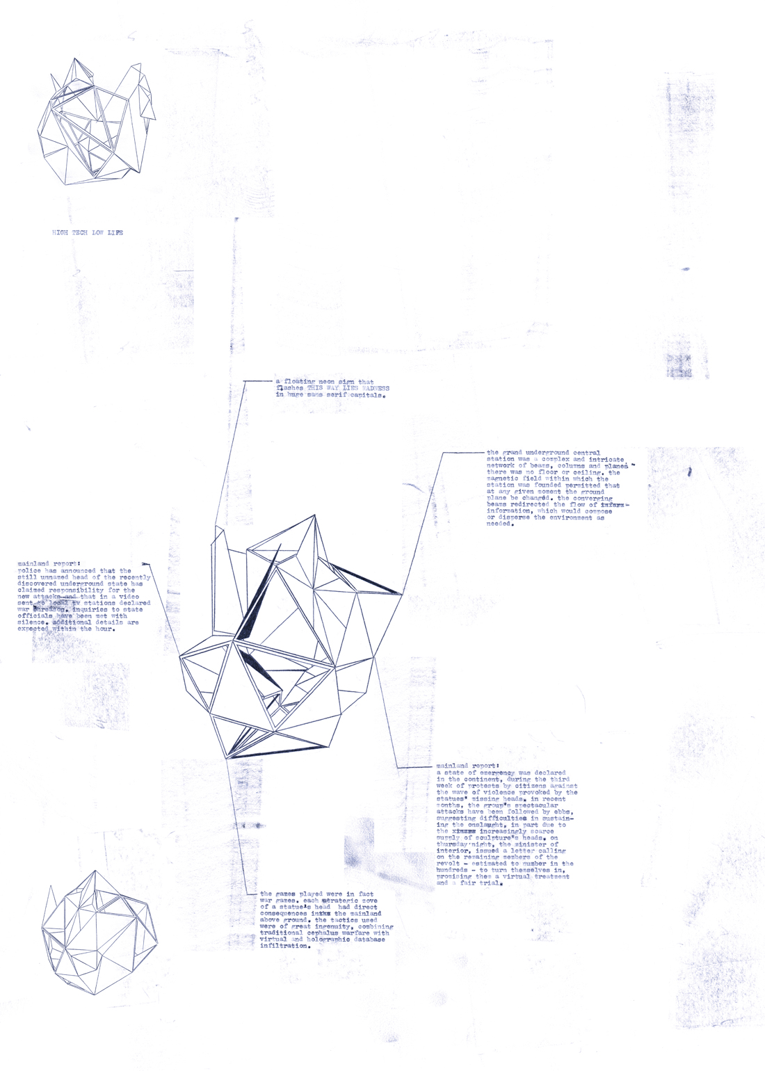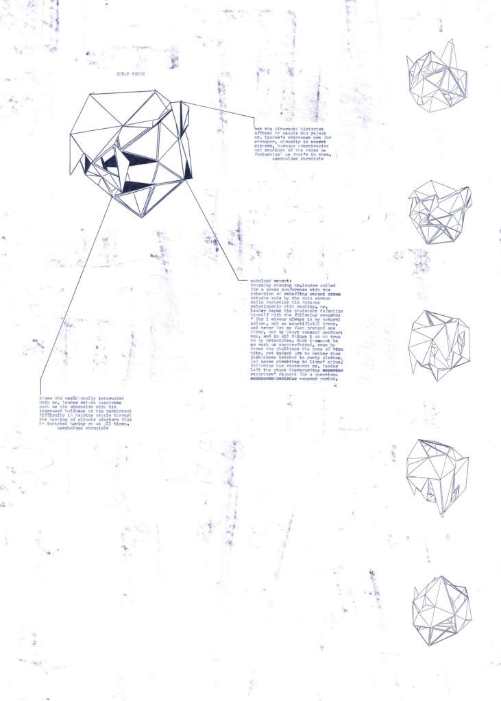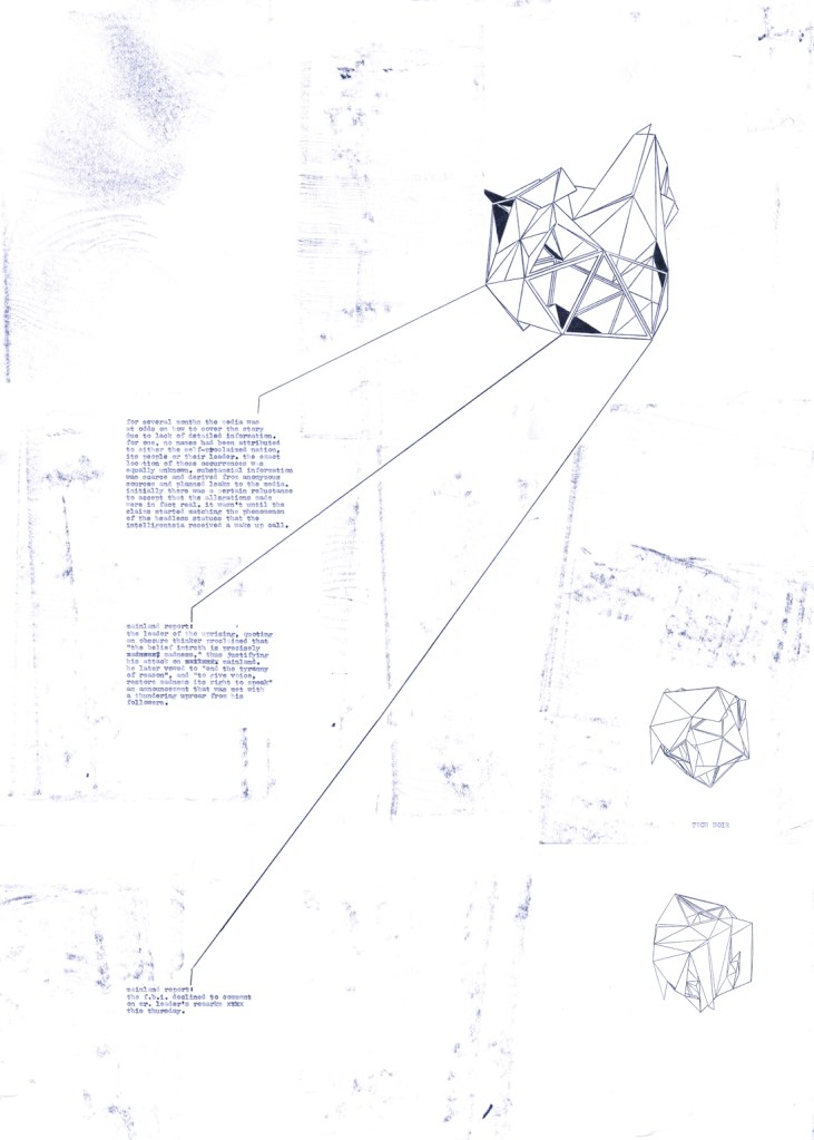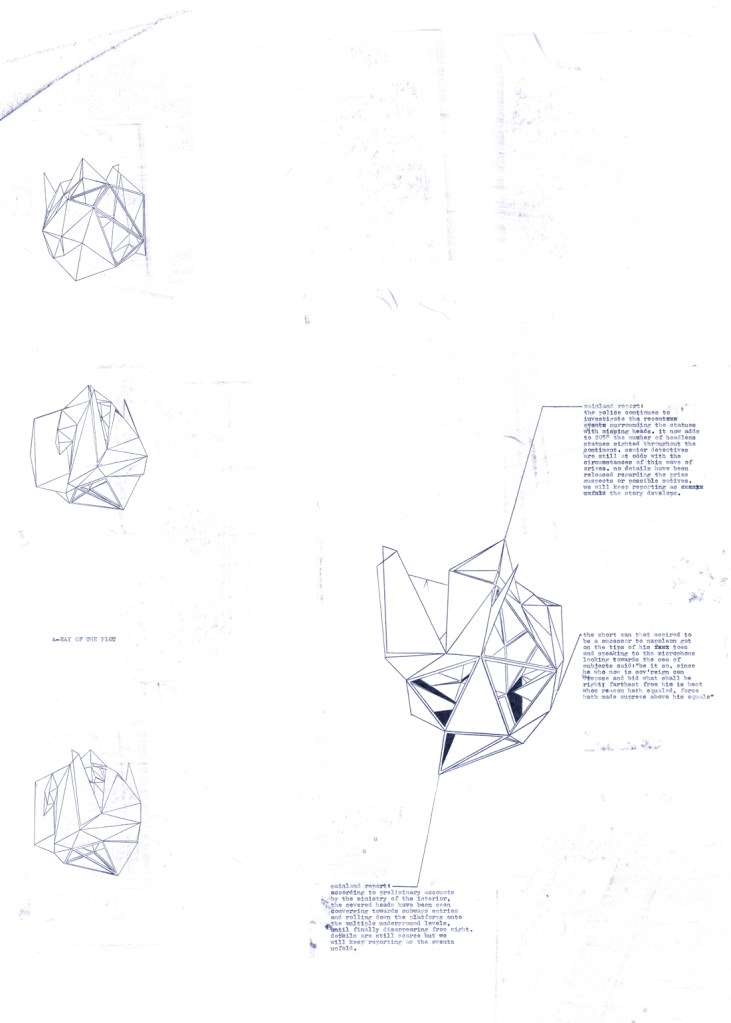 X-Ray of the Plot is a series of works based on a narrative that draws from a tradition of science fiction and cyberpunk literature to relate future wartime events. When reports concerning the disappearance of statues’ heads begin to emerge throughout the world, the reader is introduced to a previously unknown underground nation called “Nation” and “Mr. Leader,” the initiator of this bellicose endeavor.