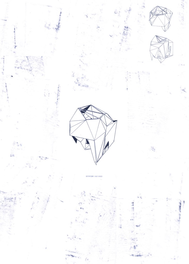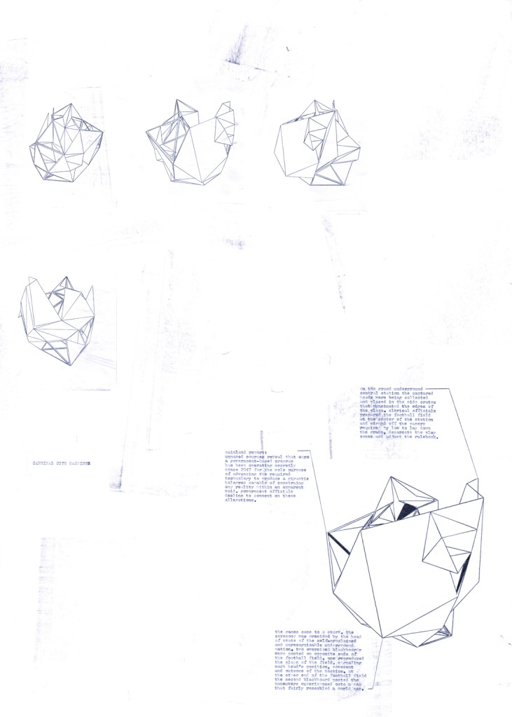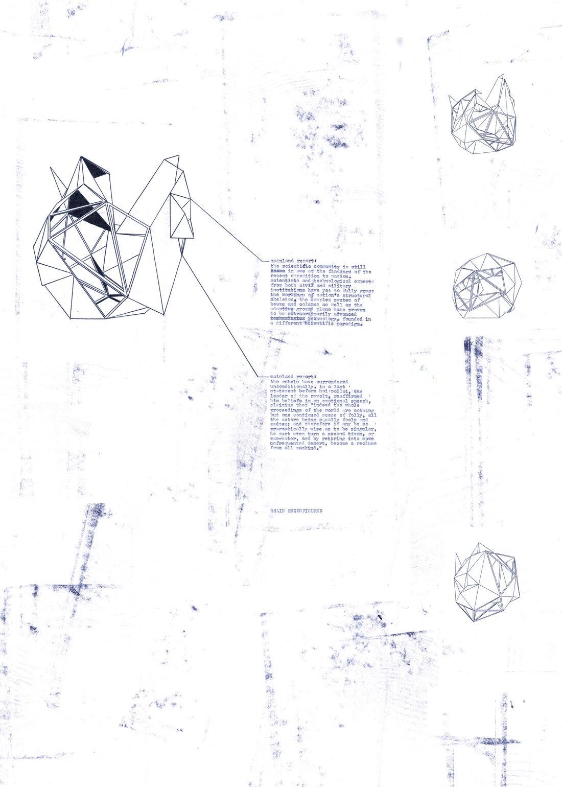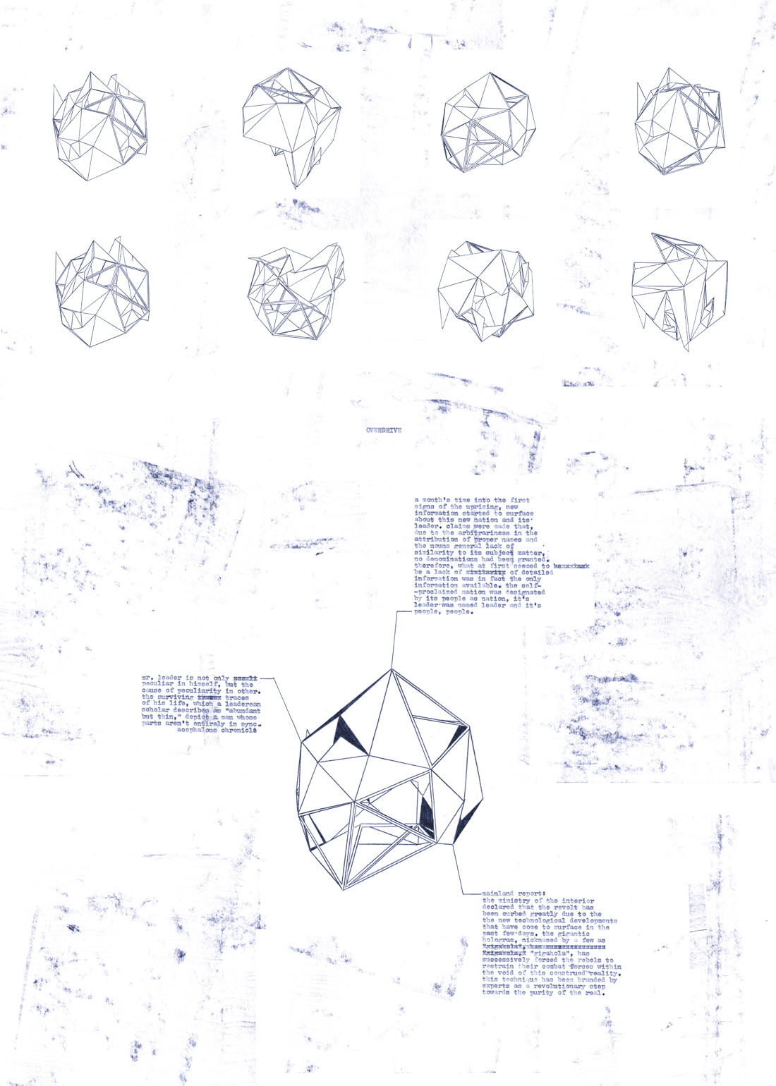 The two factions of this conflict embody a battle between sanity and madness, with the emergent Nation clamming the primacy of Unreason over Reason. Mr. Leader declares war on Sanity and sets out to prove it possible to live within a systemic unreason. This narrative is presented in a series of prints, where the three-dimensional structure of the plot is exposed in its various viewpoints; that is, much like an x-ray plate, the plot’s structure is analyzed from all angles.